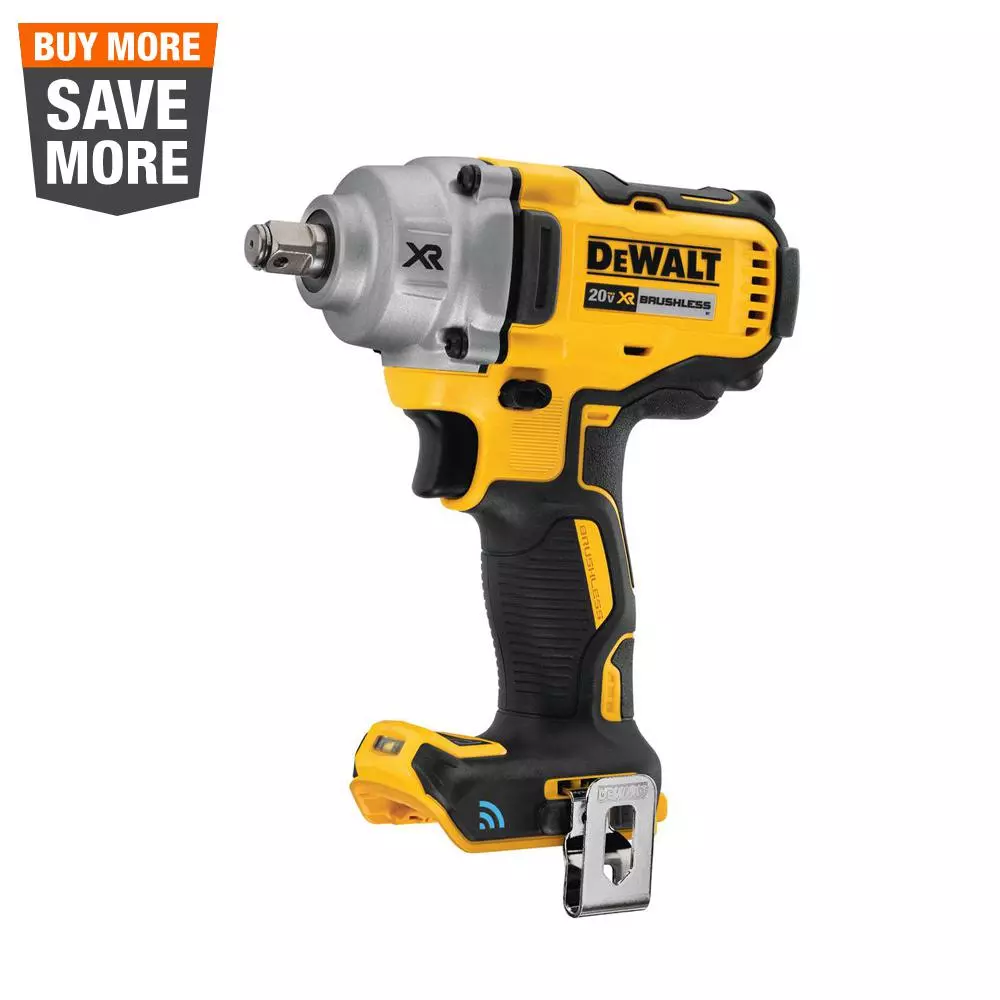 The DEWALT DCF896 20-Volt MAX Lithium Ion Cordless Brushless 1/2 in. Impact Wrench with Hog Ring Anvil and Tool Connect is based off of the latest edition to the DEWALT impact wrench family, the DCF894. Integrated Bluetooth technology pairs this tool with the free Tool Connect mobile app and online inventory manager portal, allowing users to track, manage and customize the tool settings. Through the app, users are able to program 3-customized modes based on individual needs and have control over forward and reverse speed to account for different fastener sizes and types, LED brightness and delay as well as Precision Wrench and the all new exclusive Precision Tap modes. Within Precision Wrench, users can program the tool to automatically shut off after impacting for a set amount of time, useful for those performing repeatable applications and helps with tightening consistency by removing variability in impact time. Precision Tap mode is designed to make tapping threads faster and easier by having the tool automatically alternate between forward and reverse, keeping rotations consistent and eliminating the need to manually change the toolβs direction. Use this tool along with other Tool Connect offerings for a complete management solution.