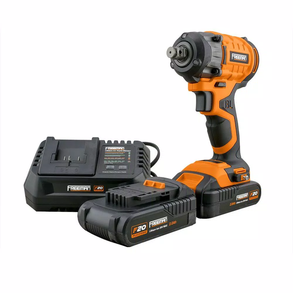 The Freeman P12IW Cordless and Brushless 20-Volt 1/2 in. Impact Wrench with Case is specifically designed to eliminate hand ratcheting in tight spaces during bolting, construction, mechanical and automotive projects. Perfect for professional mechanics and DIYers fixing their car at home, this 20-Volt lithium-ion battery powered tool removes even rusty nuts and bolts with ease. Make quick work of tire rotations, engine repairs, tune ups and any high torque situation. The powerful brushless motor efficiently produces up to 230 ft./lbs. of torque and a free speed up to 2,500 RPM. A variable speed switch trigger delivers higher speed with increased pressure and 3 variable speeds are controlled by the speed selector button. Toggle between forward and reverse (or lock) with the rotation direction switch near the trigger. 3 convenient LED lights illuminate dimly lit work areas. The Cordless and Brushless 20-Volt 1/2 in. Impact Wrench includes a blow molded carrying case, 2 high capacity 20-Volt 2.0 Ah lithium-ion batteries, rapid charger, and belt clip, and is covered by Freemanβs 1-year Limited Warranty.