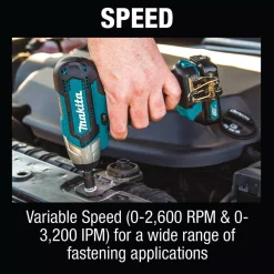 - Variable speed (0 RPM to 2,600 RPM and 0 IPM to 3,200 IPM) for a wide range of fastening applications