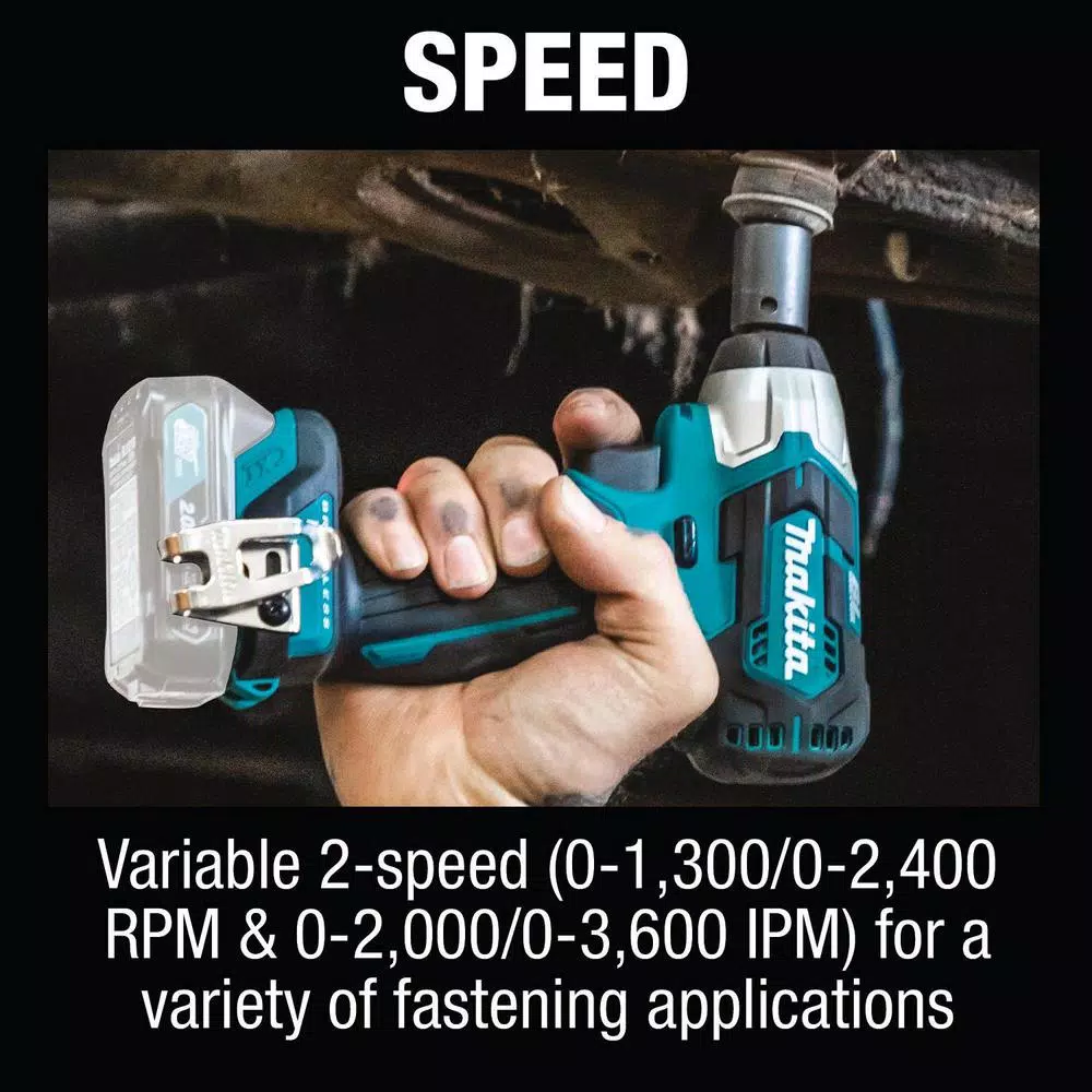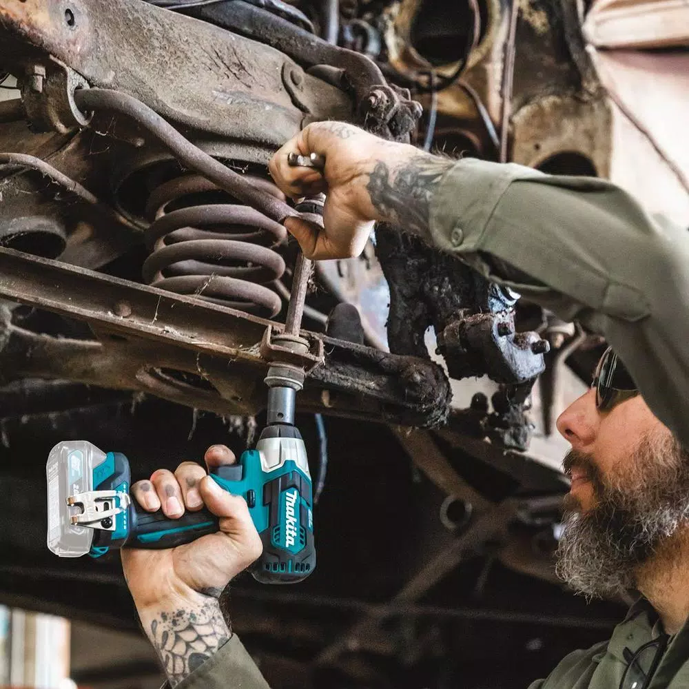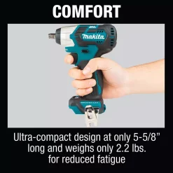 The Makita 12-Volt Max CXT Cordless 3/8 Sq. Drive Impact Wrench Kit (WT05Z) delivers power and speed in a compact size for efficient fastening. It is an ideal solution for working in tight spaces and overhead applications. The 12-Volt Max CXT 3/8 Sq. Drive Impact Wrench weighs only 2.2 lbs. (with 2.0 Ah battery, sold separately), with variable speed (0-2,400 RPM and 0-3,600 IPM) and 120 ft. lbs. of Max Torque. Makitaโs entire line-up of impact drivers and impact wrenches including the WT05Z is engineered with a proprietary hammer and anvil impact mechanism that is manufactured using the best raw materials with the highest quality steel, as well as a unique heat-hardening process for maximum fastening and driving power. With Makita 12-Volt Max CXT Lithium-Ion slide-style batteries (sold separately), users get superior balance and ergonomics over pod-style batteries. For longer run time, 12-Volt Max CXT cordless tools are also compatible with the 12-Volt Max CXT Lithium-Ion 4.0 Ah battery (BL1041B). 12-Volt Max CXT Lithium-Ion batteries are engineered with a Battery Protection Circuit that protects against overloading, over-discharging and over-heating. Its part of the expanding 12-Volt Max CXT series, combining performance with superior ergonomics in a compact size.