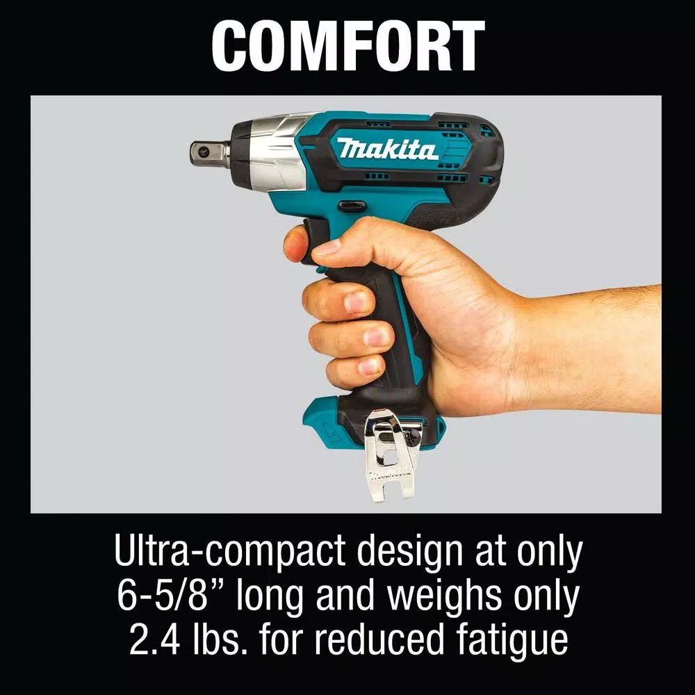 The Makita 12V max CXT Cordless 1/2 in. Impact Wrench, Tool Only (WT03Z) delivers power and speed in a compact size for efficient fastening. It is an ideal solution for working in tight spaces and overhead applications. With Makita 12V max CXT Lithium-Ion slide-style batteries (sold separately), users get superior balance and ergonomics over pod-style batteries. For longer run time, 12V max CXT cordless tools are also compatible with the 12V max CXT Lithium-Ion 4.0Ah battery (BL1041B). 12V max CXT Lithium-Ion batteries are engineered with a Battery Protection Circuit that protects against overloading, over-discharging and over-heating. Itโs part of the expanding 12V max CXT series, combining performance with superior ergonomics in a compact size. Makitaโs entire line-up of impact drivers and impact wrenches including the WT03Z is engineered with a proprietary hammer and anvil impact mechanism that is manufactured using the best raw materials with the highest quality steel, as well as a unique heat-hardening process for maximum fastening and driving power. This promotion also includes a bonus BL1041B 12V max CXT Lithium-Ion 4.0Ah Battery.
