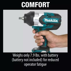 The Makita 18-Volt LXT Lithium-Ion Brushless Cordless High Torque 1/2 IN. Sq. Drive Impact Wrench (XWT08XVZ, tool only, batteries and charger sold separately) combines 740 ft. lbs. fastening torque and 1,180 ft. lbs. break-away torque with extended run time and speed control for unmatched fastening performance. It features an efficient Makita brushless motor for longer run time, increased power and speed, and longer tool life. The electronic 3-speed power selection switch gives users more precise fastening control. It is ideal for a range of users, from iron and steel workers to pipe fitters, railroad and automotive mechanics, forming carpenters, and more. Its part of Makitaโs expanding 18-Volt Lithium-Ion system, the worlds largest cordless tool system powered by 18-Volt Lithium-Ion slide-style batteries. Makita 18-Volt Lithium-Ion batteries have the fastest charge times in their categories, so they spend more time working and less time sitting on the charger. For improved tool performance and extended battery life, Makita created Star Protection Computer Controls. Star Protection is communication technology that allows the Star Protection-equipped tool and battery to exchange data in real time and monitor conditions during use to protect against overloading, over-discharging and overheating. For increased versatility, the tool can also be powered by Makita 18-Volt LXT and Compact Lithium-Ion batteries with the Star Symbol on the battery indicating Star Protection inside.