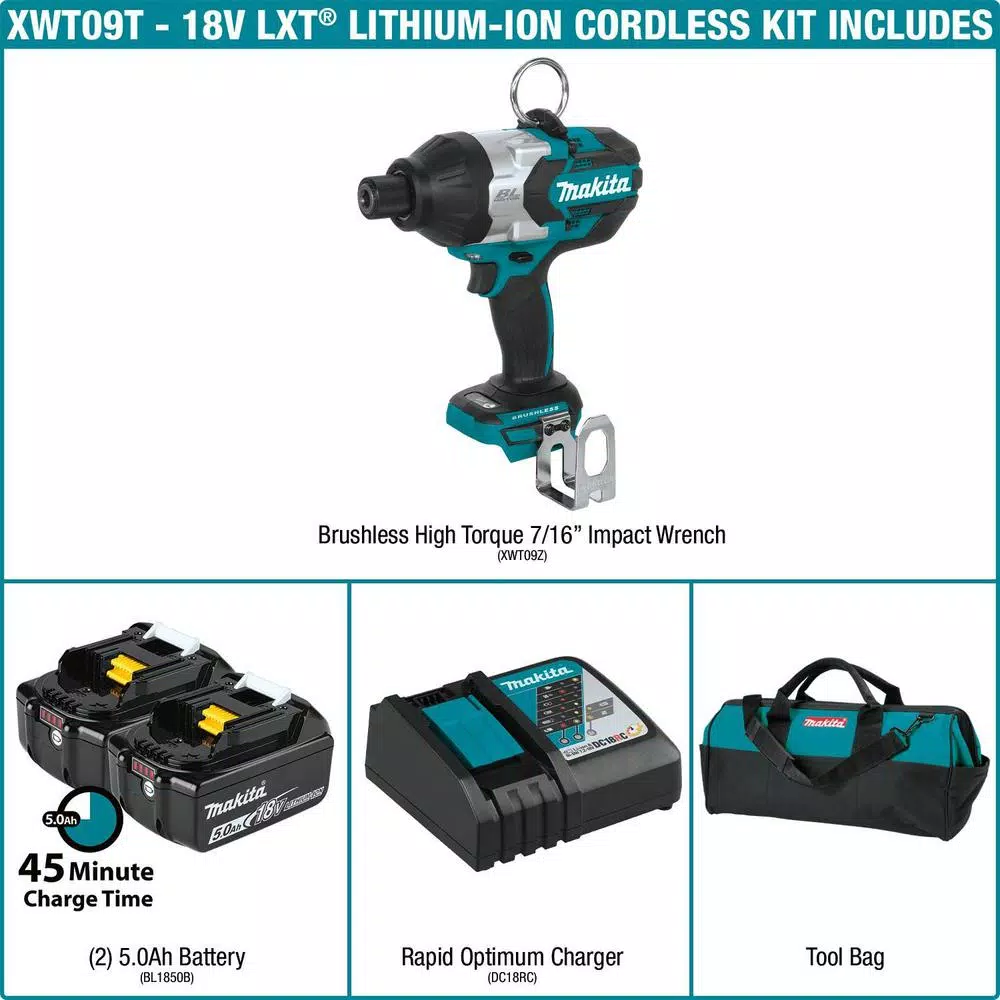 - Includes: two 18-Volt LXT lithium-ion 5.0Ah batteries (BL1850B), 18-Volt lithium-ion rapid optimum charger (DC18RC), 18-Volt LXT 7/16 in. impact wrench (XWT09Z), tool bag