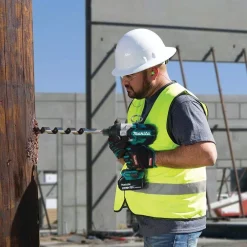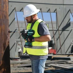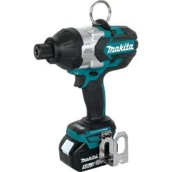 The Makita 18-Volt LXT Lithium-Ion Brushless Cordless High Torque 7/16 in. Hex Chuck Impact Wrench Kit (XWT09T) combines 590 ft. lbs. fastening torque with extended run time and speed control for unmatched fastening performance. It features an efficient Makita brushless motor for longer run time, increased power and speed and longer tool life. The electronic 3-speed power selection switch gives users more precise fastening control. With the 7/16 in. hex chuck and hanging ring, it is ideal for linemen and electricians for installation and maintenance of power lines, wood boring and more. It’s part of Makita’s expanding 18-Volt Lithium-Ion series, the world’s largest cordless tool line-up powered by an 18-Volt Lithium-Ion slide-style battery. Makita 18-Volt Lithium-Ion batteries have the fastest charge times in their categories, so they spend more time working and less time sitting on the charger. For improved tool performance and extended battery life, Makita created Star Protection Computer Controls. Star Protection is communication technology that allows the Star Protection-equipped tool and battery to exchange data in real time and monitor conditions during use to protect against overloading, over-discharging and overheating. For increased versatility, the tool can also be powered by Makita 18-Volt LXT and Compact Lithium-Ion batteries with the star symbol on the battery indicating Star Protection inside.