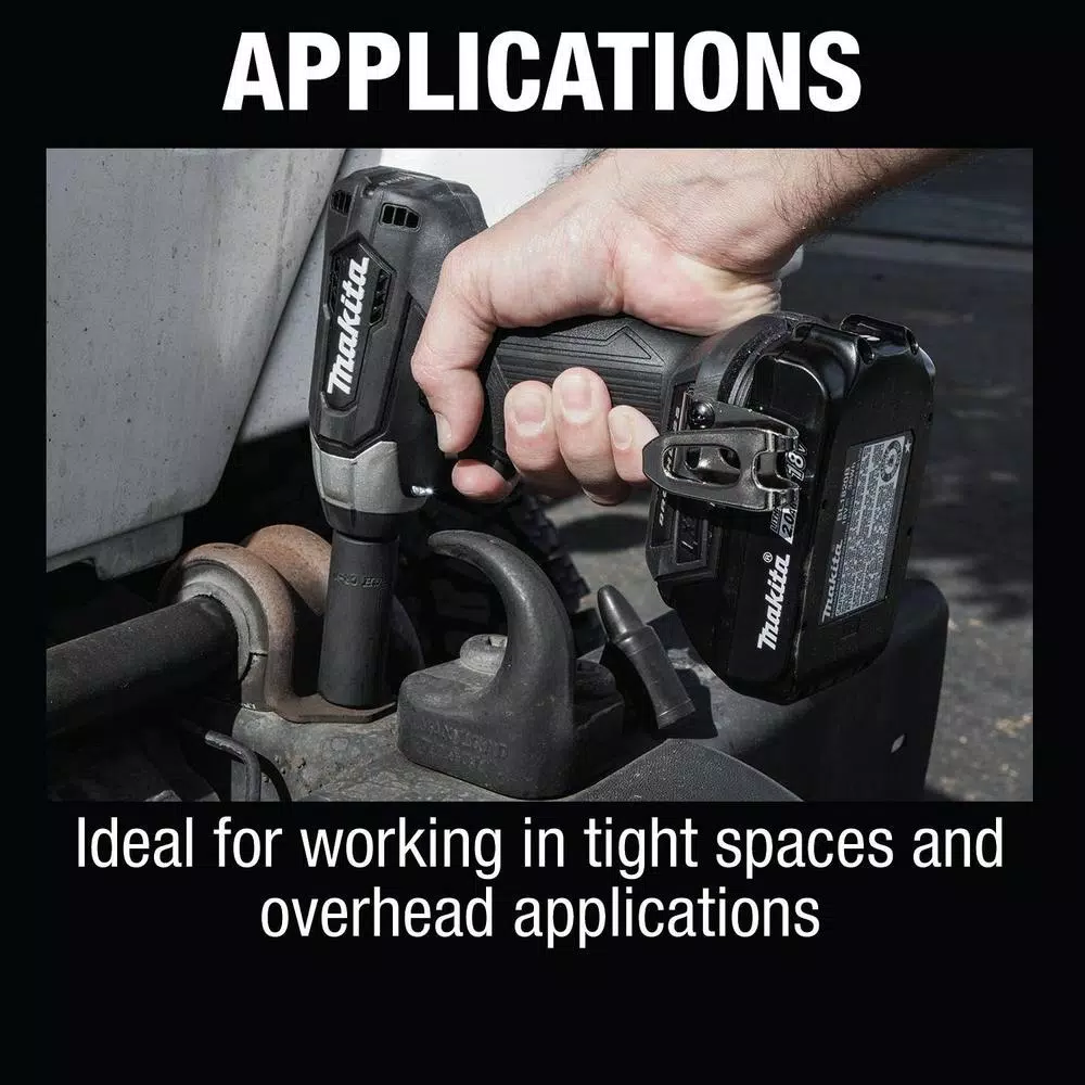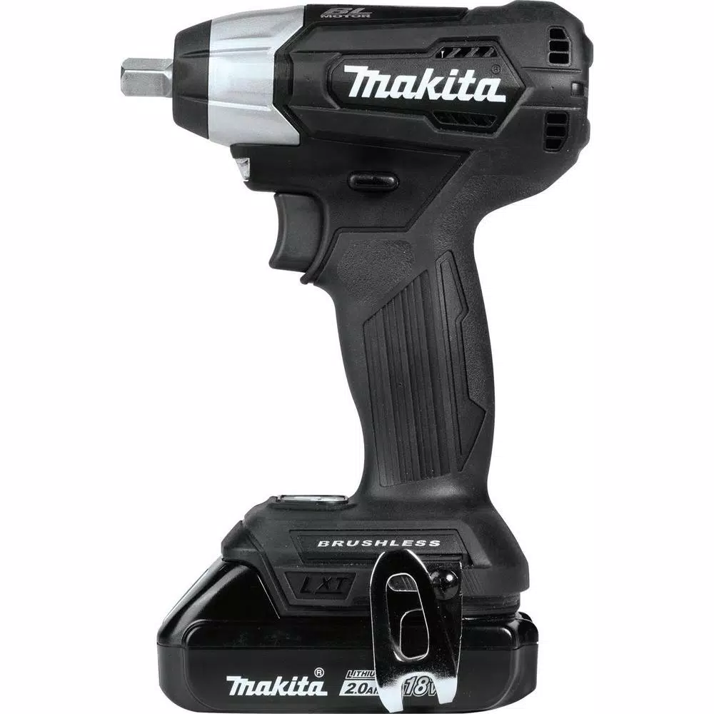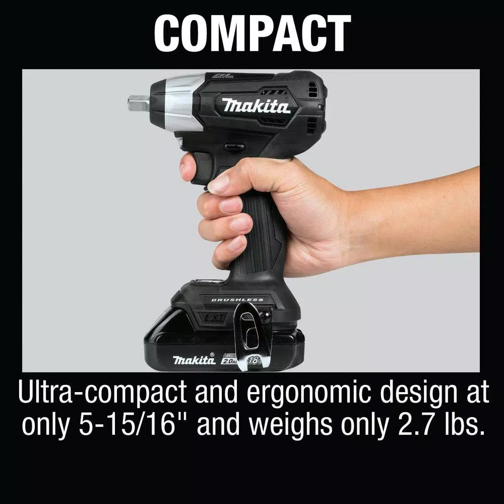 Makita created a new class in cordless with 18-Volt LXT Sub-Compact tools. Makita Sub-Compact gives users 12-Volt handling with 18-Volt run time and compatibility with the worlds largest 18-Volt lithium-ion cordless tool system. The 18-Volt LXT Sub-Compact Brushless 1/2 in. Square Drive Impact Wrench Kit is ideal for working in tight spaces and for overhead applications. The 18-Volt LXT Sub-Compact Brushless 1/2 in. Square Drive Impact Wrench has an efficient Makita Brushless Motor BL engineered for up to 50% longer run time, increased power and speed and longer tool life. It has variable 2-speed with 0 RPM to 1,300 RPM/0 RPM to 2,400 RPM and 0 IPM to 2,000 IPM/0 IPM to 3,600 IPM and up to 130 ft./lbs. of Maximum Torque. The compact size and lower weight mean reduced fatigue for operators, especially for overhead applications. For added convenience, the Reverse Rotation Auto-Stop Mode stops rotation and impact when the fastener is loosened adequately. Users also get a variable speed trigger, built-in LED lights and a convenient 1/2 in. square drive for quick socket changes. It features Makita Extreme Protection Technology (XPT).