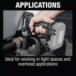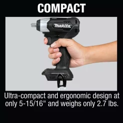 Makita created a new class in cordless with 18-Volt LXT Sub-Compact tools. Makita Sub-Compact gives users 12-Volt handling with 18-Volt run time and compatibility with the worlds largest 18-Volt lithium-ion cordless tool system. The 18-Volt LXT Sub-Compact Brushless 1/2 in. Square Drive Impact Wrench is ideal for working in tight spaces and for overhead applications. The XWT13ZB has an efficient Makita Brushless Motor BL engineered for up to 50% longer run time, increased power and speed and longer tool life. It has variable 2-speed with 0 RPM to 1,300 RPM/0 RPM to 2,400 RPM and 0 IPM to 2,000 IPM/0 IPM to 3,600 IPM and up to 130 ft./lbs. of Maximum Torque. The compact size and lower weight mean reduced fatigue for operators, especially for overhead applications. For added convenience, the Reverse Rotation Auto-Stop Mode stops rotation and impact when the fastener is loosened adequately. Users also get a variable speed trigger, built-in LED lights and a convenient 1/2 in. square drive for quick socket changes. It features Makita Extreme Protection Technology (XPT).