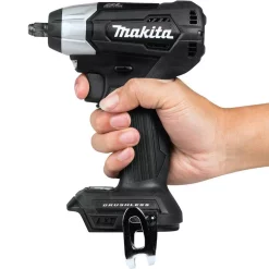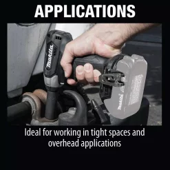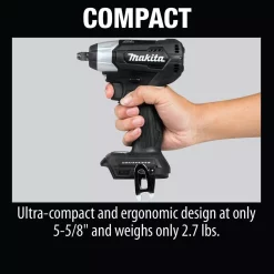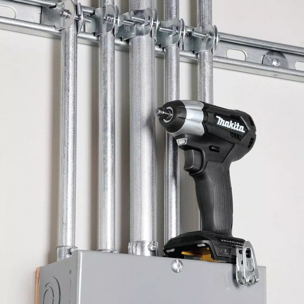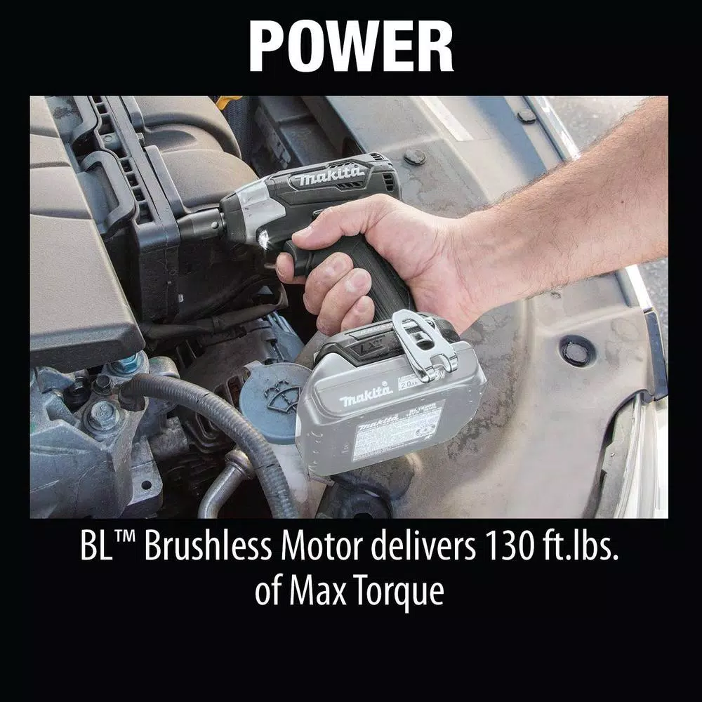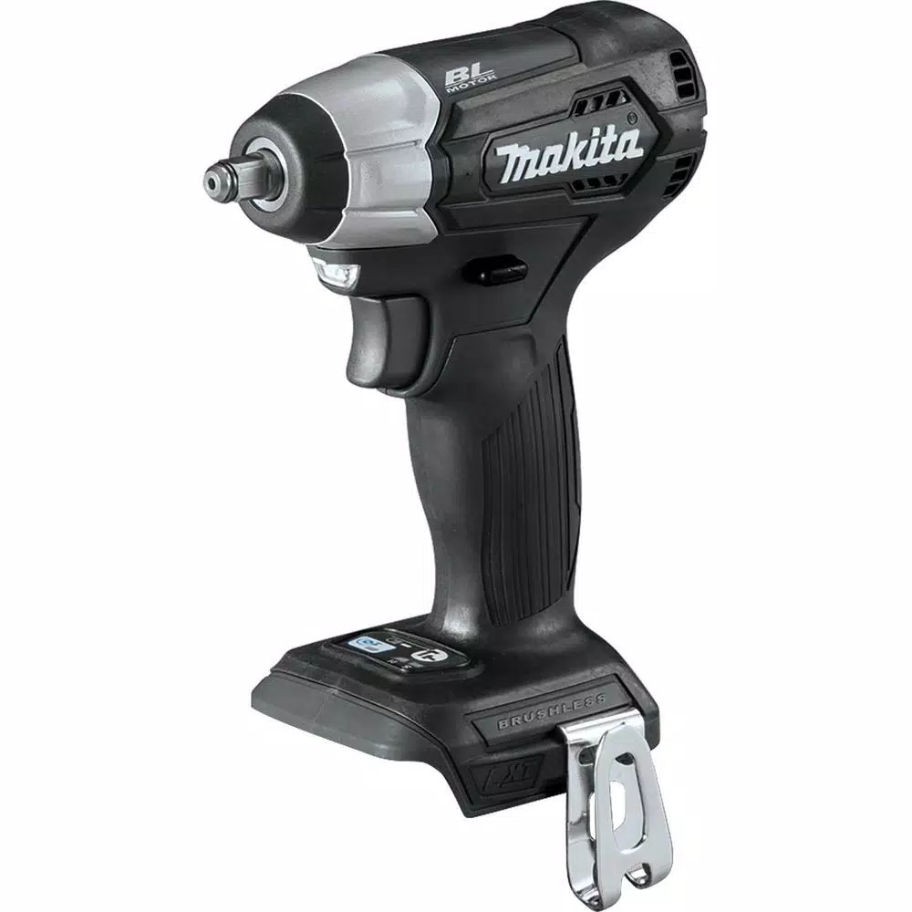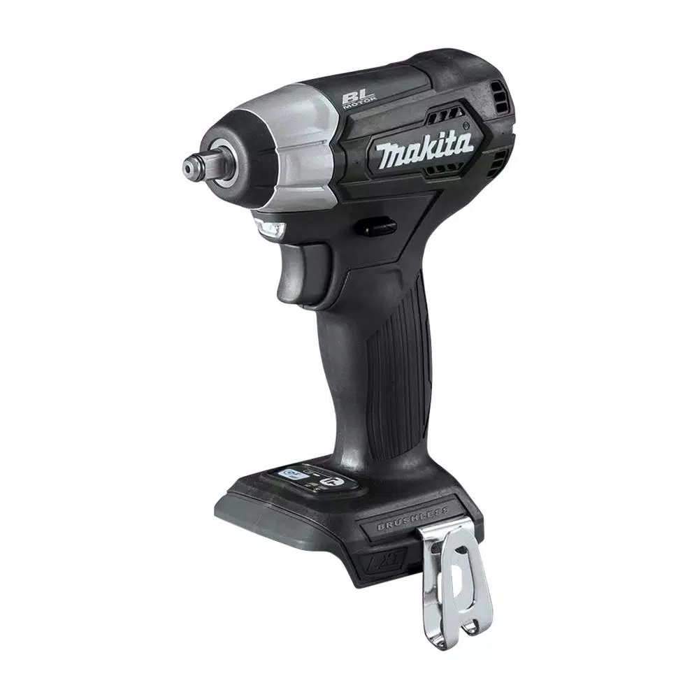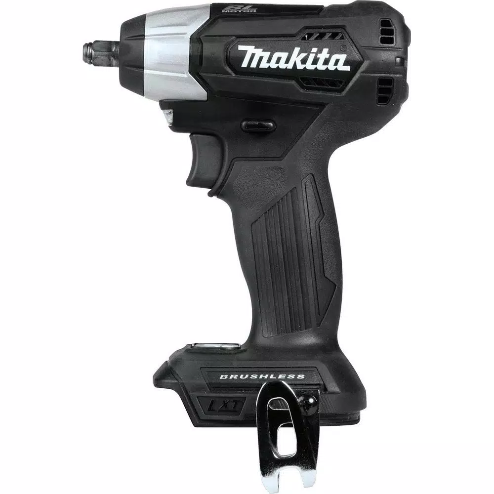 Makita created a new class in cordless with 18V LXT Sub-Compact tools. Makita Sub-Compact gives users 12V handling with 18V run time and compatibility with the worldโs largest 18V lithium-ion cordless tool system. The 18V LXT Sub-Compact Brushless 3/8 in. Square Drive Impact Wrench is ideal for working in tight spaces and for overhead applications. The XWT12ZB has an efficient Makita BL Brushless Motor engineered for up to 50% longer run time, increased power and speed, and longer tool life. It has variable two-speed with 0-1,300/0-2,400 RPM and 0-2,000/0-3,600 IPM and up to 130 ft. lbs. of Max Torque. The compact size and lower weight mean reduced fatigue for operators, especially for overhead applications. For added convenience, the Reverse Rotation Auto-Stop Mode stops rotation and impact when the fastener is loosened adequately. Users also get a variable speed trigger, built-in L.E.D. lights, and a convenient 3/8 in. square drive for quick socket changes. It features Makita Extreme Protection Technology (XPT). XPT is a protective seal inside the tool and is engineered for improved operation in harsh conditions by channeling water and dust from key internal components.