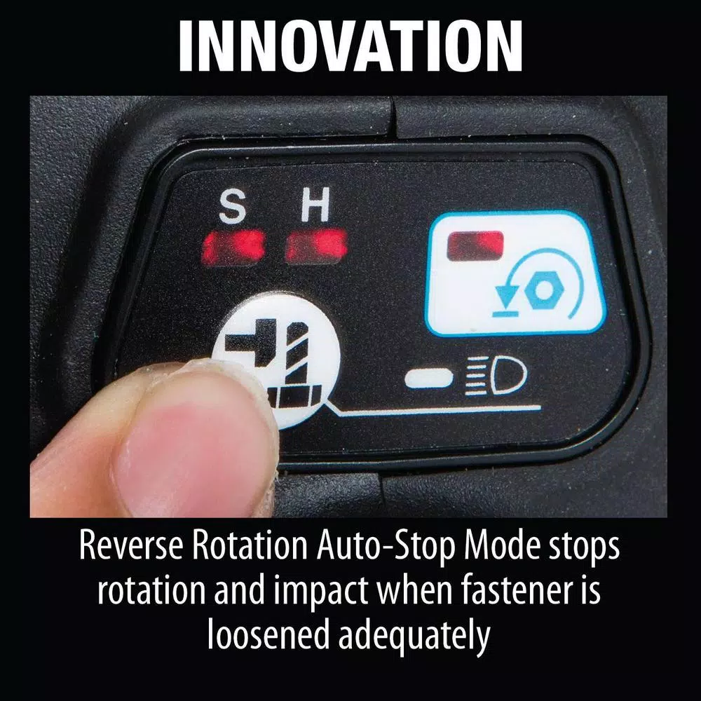 - Reverse Rotation Auto-Stop Mode stops rotation and impact when fastener is loosened adequately