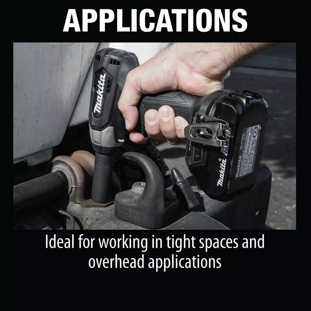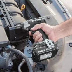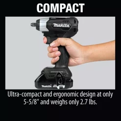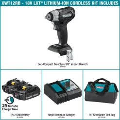 Makita created a new class in cordless with 18V LXT Sub-Compact tools. Makita Sub-Compact gives users 12V handling with 18V run time and compatibility with the world’s largest 18V lithium-ion cordless tool system. The 18V LXT Sub-Compact Brushless 3/8 in. Square Drive Impact Wrench is ideal for working in tight spaces and for overhead applications.The XWT12RB has an efficient Makita BL Brushless Motor engineered for up to 50% longer run time, increased power and speed, and longer tool life. It has variable two-speed with 0-1,300/0-2,400 RPM and 0-2,000/0-3,600 IPM and up to 130 ft.lbs.of Max Torque. The compact size and lower weight mean reduced fatigue for operators, especially for overhead applications. For added convenience, the Reverse Rotation Auto-Stop Mode stops rotation and impact when the fastener is loosened adequately. Users also get a variable speed trigger, built-in L.E.D. lights, and a convenient 3/8” square drive for quick socket changes.It features Makita Extreme Protection Technology (XPT). XPT is a protective seal inside the tool, and is engineered for improved operation in harsh conditions by channeling water and dust from key internal components.It’s part of Makita’s expanding 18V LXT system, the world’s largest cordless tool system powered by 18V Lithium-Ion batteries. Makita 18V LXT batteries have the fastest charge times in their categories, so they spend more time working and less time sitting on the charger.
