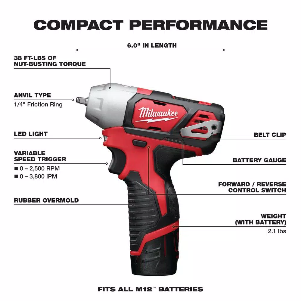 - Includes: (1) M12β’ ΒΌβ Impact Wrench (Bare Tool) (2461-20), (2) M12β’ REDLITHIUMβ’ Battery (48-11-2401), (1) M12β’ Lithium-ion Battery Charger (48-59-2401), (1) Belt Clip, (1) Carrying Case
