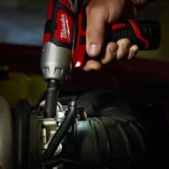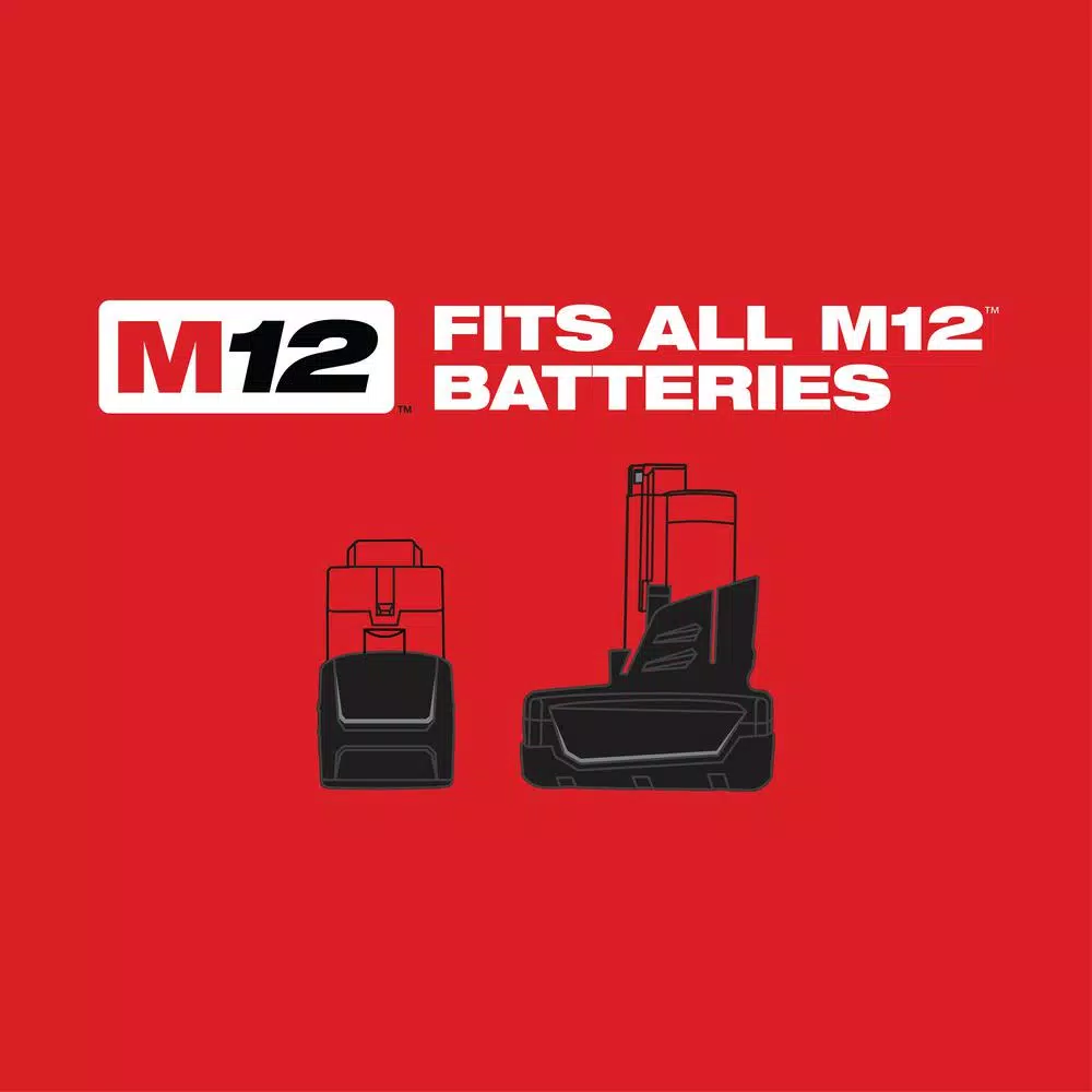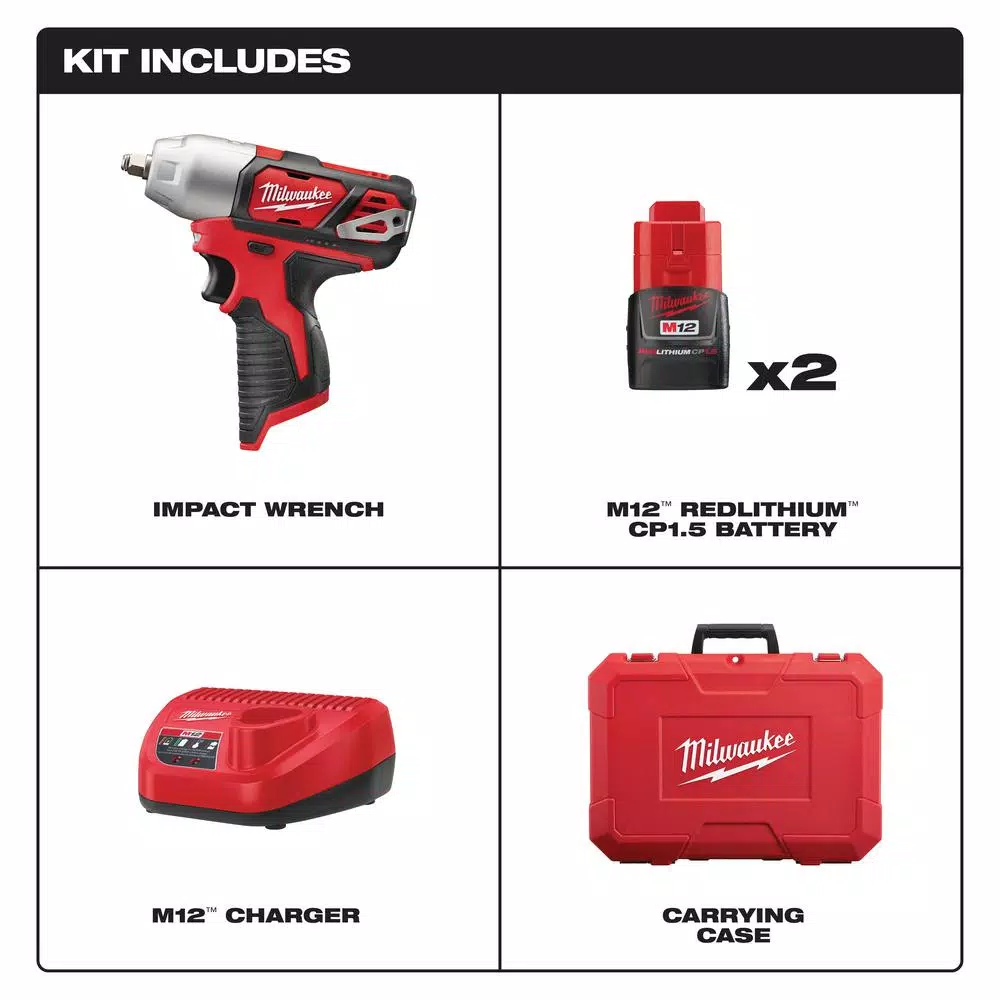 - Includes: (1) M12 3/8 impact wrench (bare tool) (2463-20), (2) M12 redlithium battery (48-11-2401), (1) M12 lithium-ion battery charger (48-59-2401), (1) belt clip, (1) carrying case