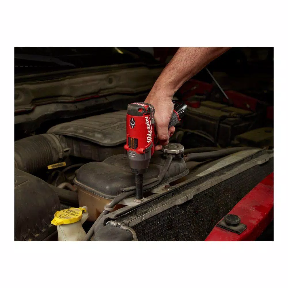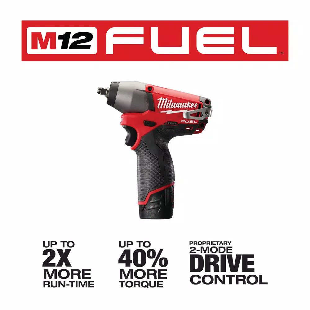 The M12 FUEL Brushless Cordless 3/8 in. Impact Wrench optimizes torque in tight spaces. This lightweight yet powerful impact wrench offers up to 3X longer motor life, up to 2X more runtime and proprietary Milwaukee 2-Mode DRIVE CONTROL for better control over the power and speed required for specific applications. The POWERSTATE Brushless Motor outperforms all leading competitors with constant power output, yet runs cooler with no wearable components. The REDLITHIUM 2.0 Compact Battery Pack delivers up to 20% more power and 2X more recharges than standard lithium-ion batteries, as well as best-in-class performance in extreme jobsite conditions. The onboard fuel gauge helps you monitor the charge more accurately, so there’s less downtime on the job. REDLINK PLUS intelligence ensures optimized performance and protection from overload, overheating and over-discharge. The M12 FUEL 3/8 in. Impact Wrench provides up to 1,400 in./lbs. of torque. Its compact size and weight drive more control and less user exertion. The built-in LED light illuminates work surfaces in dark locations.
