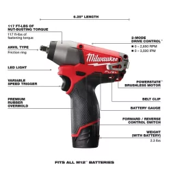 - Includes: M12 FUEL brushless 3/8 in. impact wrench, two M12 REDLITHIUM 2.0Ah batteries, M12 30-minute lithium-ion charger, tool bag and belt clip