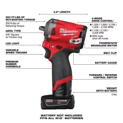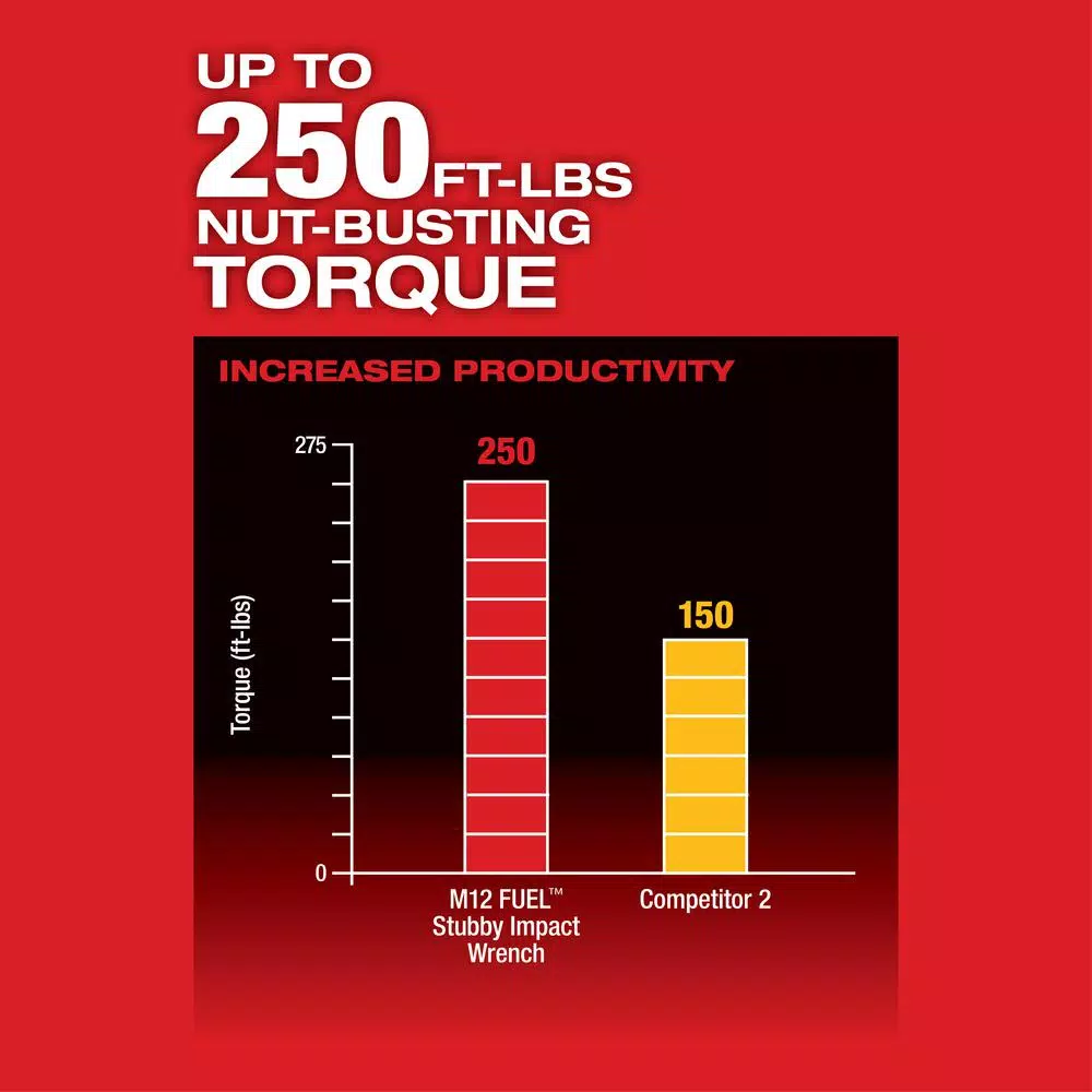 The M12 FUEL Cordless Brushless 3/8 in. Stubby Impact Wrench is the industries most compact impact wrench on the market place. Measuring only 4.8 in. L, this tool fits in tighter spaces, making users more productive. Increased torque delivers an industry leading 250 ft./lbs. of breakaway torque, removing even the most stubborn bolts and fasteners. 4-Mode Drive Control, will allow unmatched control in various fastening applications. 1-3 RPM allows for precision control and Auto-Shut Off Mode in the 4th setting will prevent over fastening of bolts while doing reassembly work.