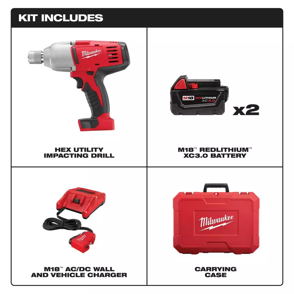 - Includes: (1) M18 7/16 in. hex high-torque impact wrench with friction ring (2665-20), (1) M18 lithium-ion AC/DC wall and vehicle charger (2710-20), (2) M18 XC high capacity REDLITHIUM battery (48-11-1828), (1) contractor bag