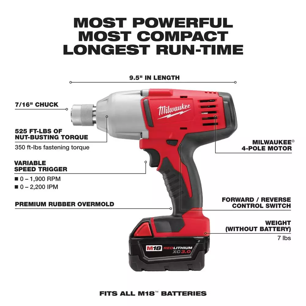 Get industry-leading power and performance in a compact size. The M18 Cordless Lithium-ion 7/16 in. Hex High-Torque Impact Wrench features a Milwaukee 4-pole motor and powerful impact mechanism to deliver a reliable 350 ft. lbs. of torque with maximum runtime. The REDLITHIUM 4.0 Extended Capacity Battery Pack delivers more work per charge and more work over pack life than the competitors, as well as best-in-class performance in extreme jobsite conditions. Youll get consistent speed control between 0-1900 RPM and 0-2200 IPM with the variable-speed trigger. A 7/16 in. hex chuck anvil with friction ring provides quick and easy accessory changes. The M18 Impact Wrenchs onboard, real-time battery fuel gauge helps you monitor the charge precisely, so theres less downtime on the job. Lightweight and portable, with superior ergonomics, this 18-Volt cordless power tool offers ultimate comfort during prolonged use. The kit includes 2 M18 4.0 XC batteries, an M18 lithium-ion battery charger and a carrying case.