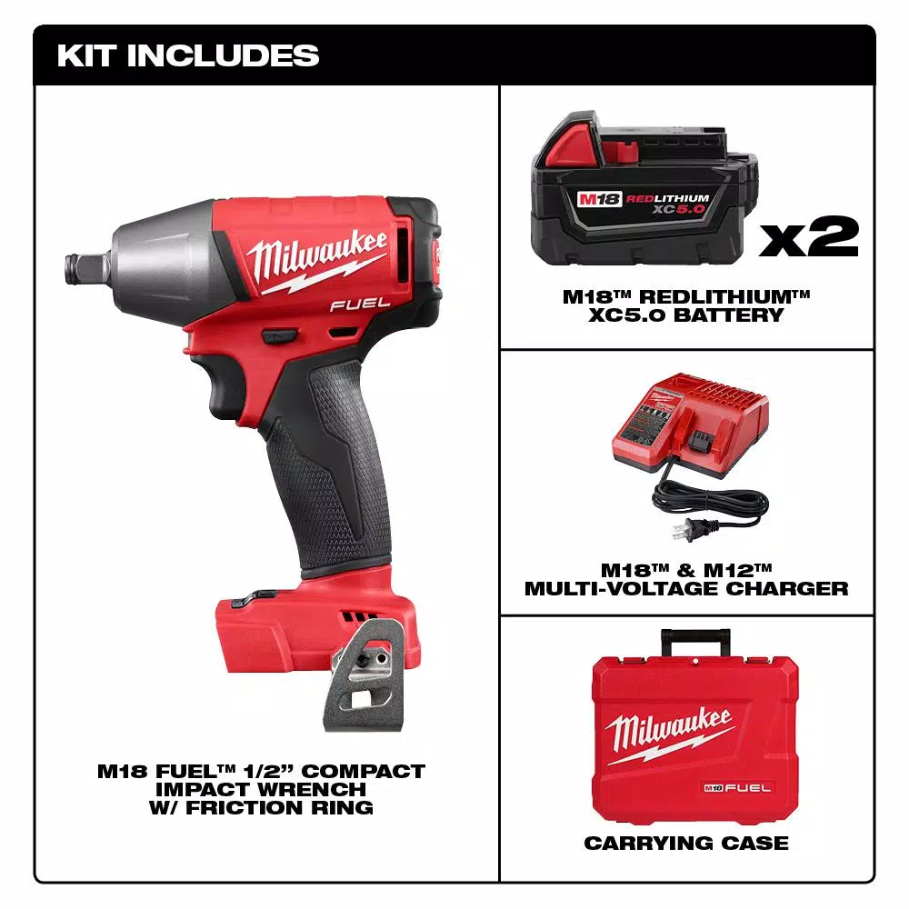 - Includes: one M18 FUEL 1/2 in. compact impact wrench with friction ring (bare tool)(2755B-20) two M18 REDLITHIUM XC5.0 extended capacity battery pack(48-11-1850) one M18 and M12 multi-voltage charger(48-59-1812) 1-belt clip 1-carrying case