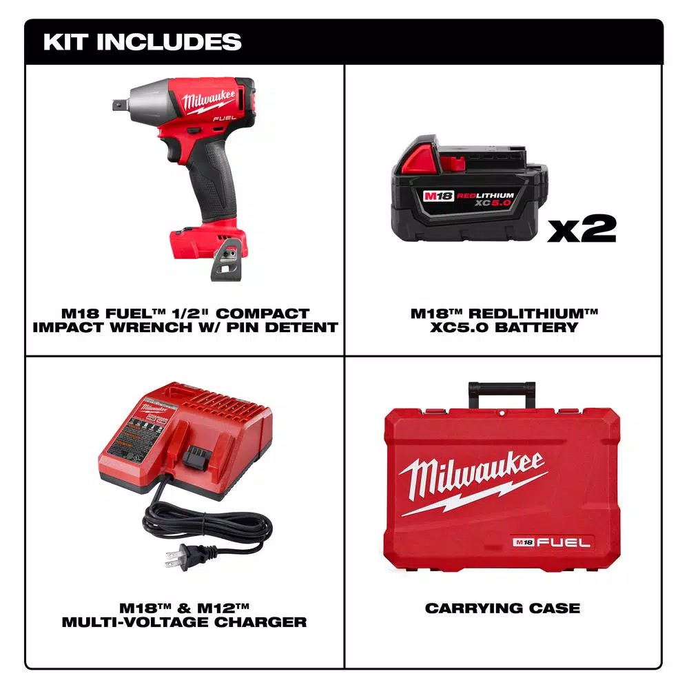 - Includes: 1-belt clip, 1-carrying case, one M18 FUEL 1/2 in. compact impact wrench with pin detent (tool only)(2755-20), two M18 REDLITHIUM XC5.0 extended capacity battery pack(48-11-1850), one M18 and M12 multi-voltage charger(48-59-1812)