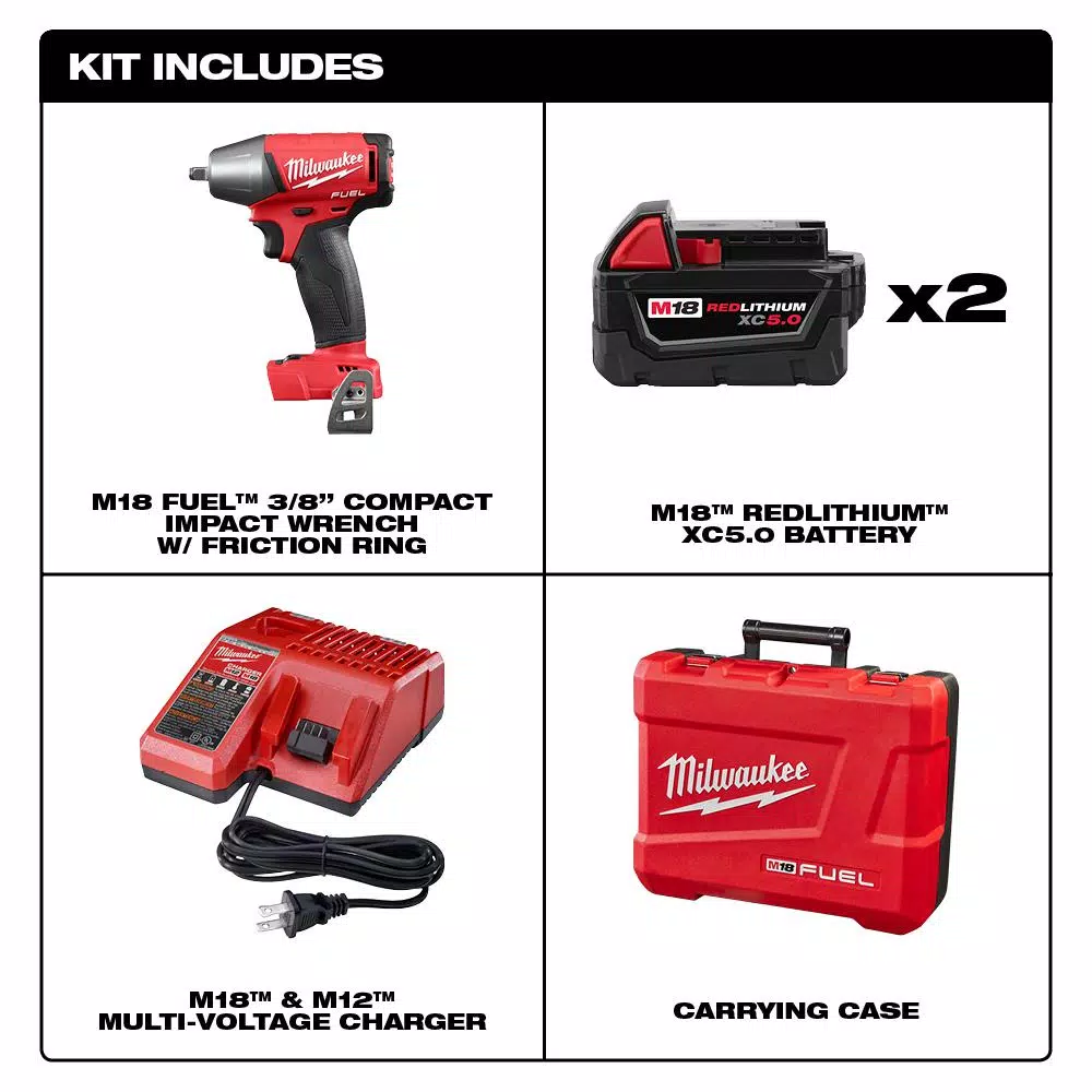 - Includes: one M18 FUEL 3/8 in. compact impact wrench with friction ring (tool only)(2754-20) two M18 REDLITHIUM XC5.0 extended capacity battery pack(48-11-1850) one M18 and M12 multi-voltage charger(48-59-1812) 1-carrying case 1-belt clip