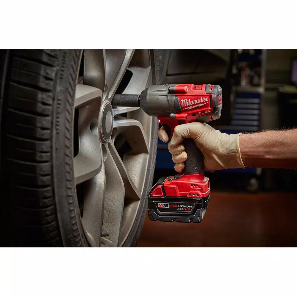 The Milwaukee M18 FUEL Mid-Torque Impact Wrench delivers 450 ft. lbs. of fastening torque and 600 ft. lbs. nut-busting torque. It is more powerful while also being up to 2 in. shorter and up to 1.5 lbs. lighter than many competitive impact wrenches. The POWERSTATE Brushless Motor gives users up to 0 RPM to 2,400 RPM resulting in increased productivity. REDLINK PLUS Intelligence is the most advanced electronic system on the market, preventing damage to the tool and battery caused by overloading or overheating. The cordless impact wrench gives users more work per charge and more work over the life of the pack when compared to competitive batteries on the market. The 3-Mode DRIVE CONTROL provides users with greater control over output speed and power for greater versatility. At 6.7 in. in length and 5.3 lbs. with a XC 5.0AH battery, the compact mid-torque impact wrench delivers the balance and weight desired by professionals for all day use. This tool allows users to perform quick, tool-free socket changes with a 1/2 in. friction ring anvil. A new over-mold material gives you ultimate comfort during prolonged use while lasting longer against corrosive materials.