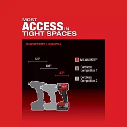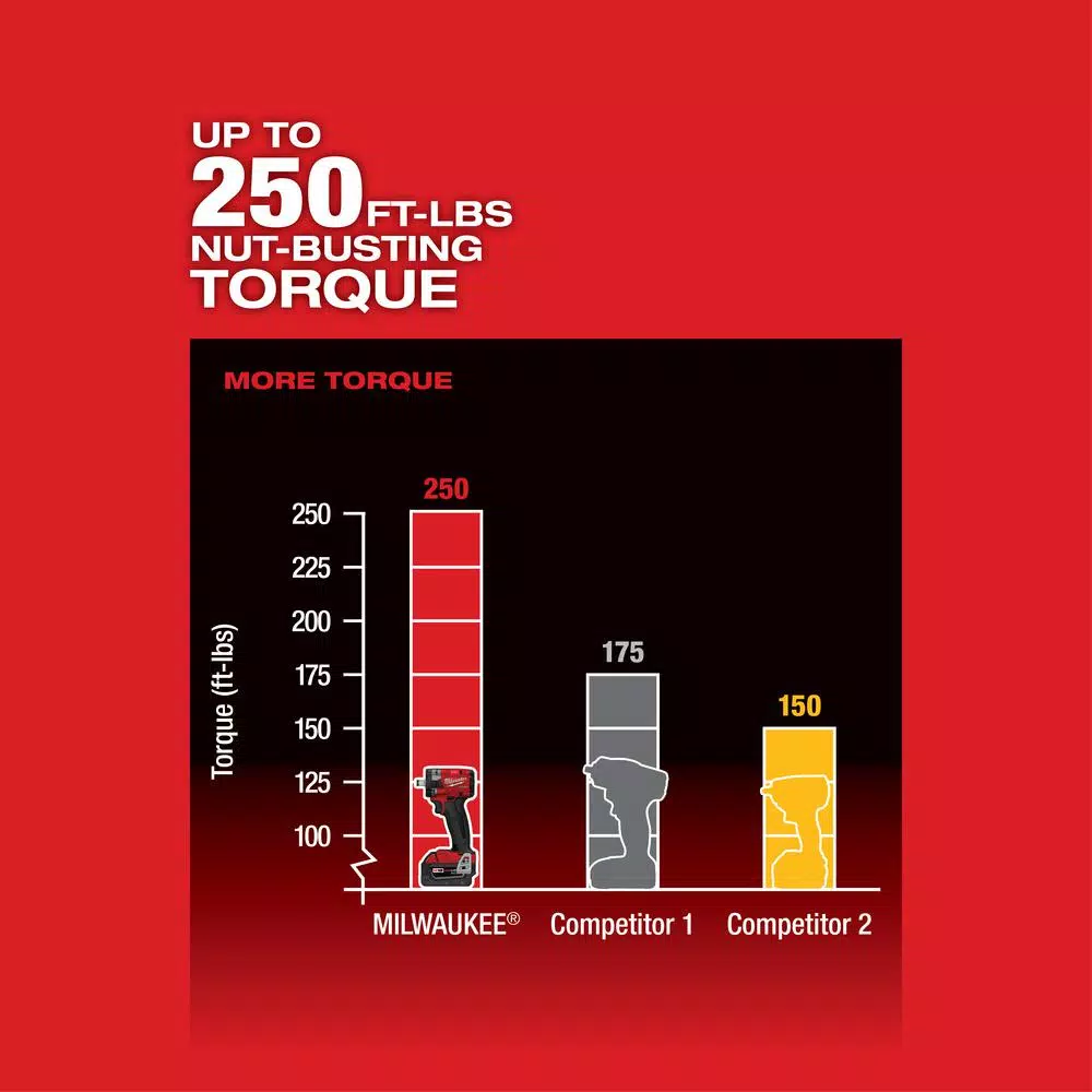 The Milwaukee M18 FUEL 1/2 in. Compact Impact Wrench with Friction Ring is the most compact in its class, delivering users the most access in tight spaces, up to 250 ft./lbs. of nut-busting torque, and maximum workspace visibility. This battery-powered impact wrench measures only 4.9 in. L with a POWERSTATE Brushless motor to provide the power to remove stubborn fasteners, even in confined spaces. The Milwaukee 1/2 in. impact wrench has tri-LEDs that surround the anvil to deliver users brighter light with fewer shadows. 4-Mode DRIVE CONTROL offers greater precision with a range of pre-set RPM and IPM levels, selectable from a single button on the tool. By selecting Mode 4, AUTO SHUT-OFF control applies no more than 20 ft./lbs. of torque for hand-tight fastening applications to prevent overtightening. Mode 4 also features Bolt Removal Control delivers full torque output, then decreases RPMs once the bolt is loosened to prevent fastener drops. REDLINK PLUS Intelligence electronics make these controls possible while ensuring maximum performance, protecting the tool against overloads, over-heating, and over-discharge.