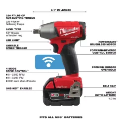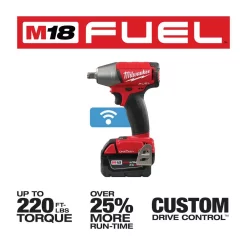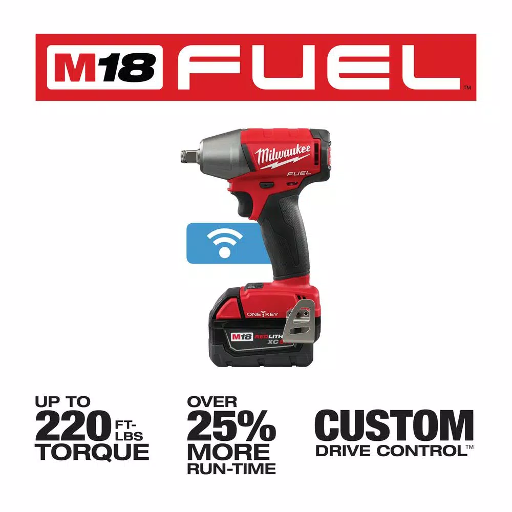 The M18 FUEL 1/2 in. Compact Impact Wrench is the Most Powerful tool in its class, delivering up to 220 ft. lbs. of torque in a compact design.Β The POWERSTATE Brushless Motor not only provides unmatched power, but also greater efficiency, delivering up to 25% more run-time than the leading competitors.Β REDLINK PLUS Intelligence is the most advanced electronic system on the market, preventing damage to the tool and battery caused by overloading or overheating.Β REDLITHIUM Batteries deliver more work per charge and more work over the life of the pack than competitive batteries on the market. Compatible with ONE-KEY, this is the industryβs first Impact Wrench that wirelessly connects to a smart phone to Customize, Track and Manage a toolβs performance and location. Unlimited Tool Customization allows you to connect to the tool and access predetermined set-ups for specific fasteners and materials, or have complete control over output speed and power for the specific application at hand. Once the desired output performance is reached, the custom profile is then saved to the memory of the tool and the connection to the smart phone is no longer necessary. The toolβs memory supports up to 4 custom profiles that can be easily accessed with the touch of a button on the tool. Integrated Tool Tracking, also available through ONE-KEY, provides full visibility to how and where tools are being used across your network of jobs and users.