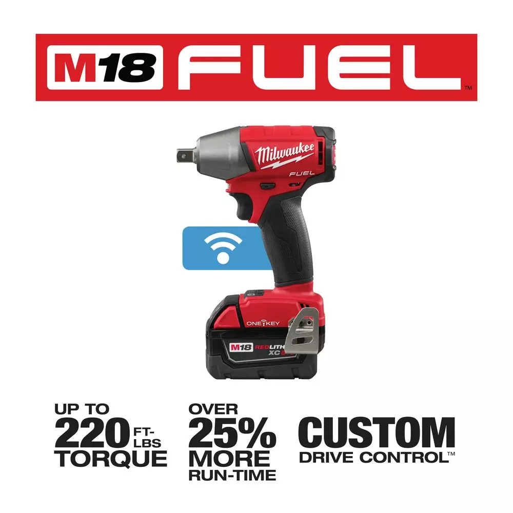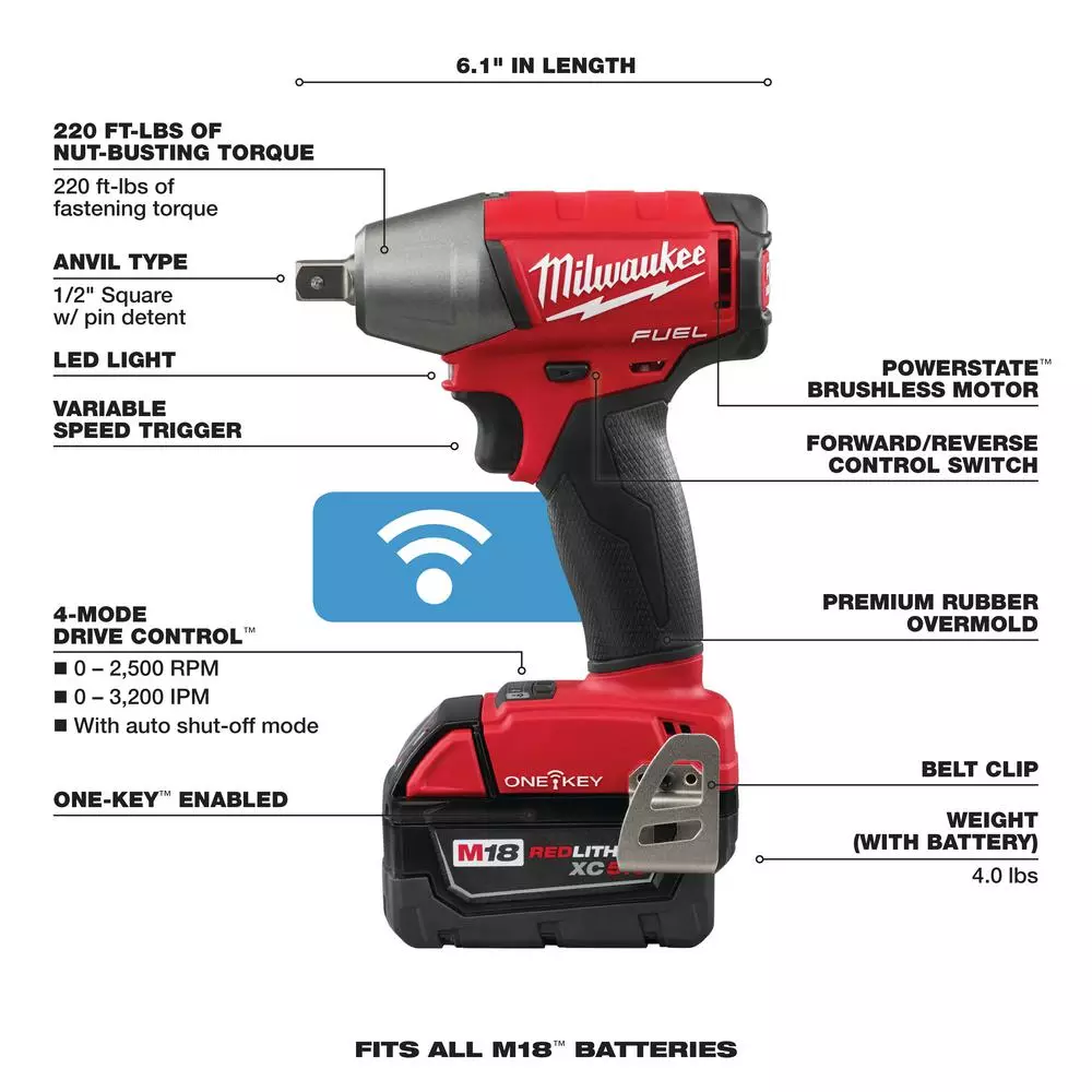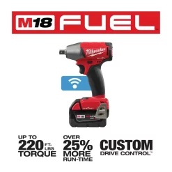 The M18 FUEL 1/2 in. Compact Impact Wrench is the Most Powerful tool in its class, delivering up to 220 ft. lbs. of torque in a compact design.Β The POWERSTATE Brushless Motor not only provides unmatched power, but also greater efficiency, delivering up to 25% more run-time than the leading competitors.Β REDLINK PLUS Intelligence is the most advanced electronic system on the market, preventing damage to the tool and battery caused by overloading or overheating.Β REDLITHIUM Batteries deliver more work per charge and more work over the life of the pack than competitive batteries on the market. Compatible with ONE-KEY, this is the industryβs first Impact Wrench that wirelessly connects to a smart phone to Customize, Track and Manage a toolβs performance and location. Unlimited Tool Customization allows you to connect to the tool and access predetermined set-ups for specific fasteners and materials, or have complete control over output speed and power for the specific application at hand. Once the desired output performance is reached, the custom profile is then saved to the memory of the tool and the connection to the smart phone is no longer necessary. The toolβs memory supports up to 4 custom profiles that can be easily accessed with the touch of a button on the tool. Integrated Tool Tracking, also available through ONE-KEY, provides full visibility to how and where tools are being used across your network of jobs and users.