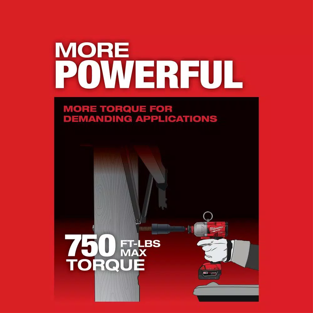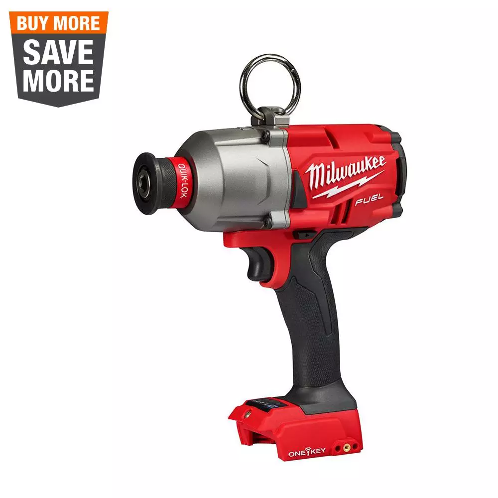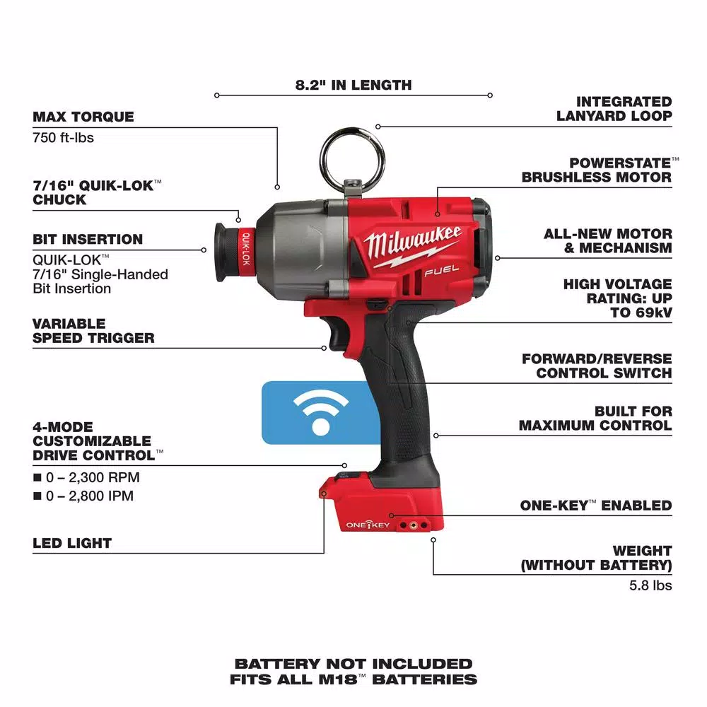 The Milwaukee M18 FUEL 7/16 in. Hex Utility High Torque Impact Wrench with ONE-KEY delivers fast drilling speed, more power and maximum control. The POWERSTATE Brushless Motor and all-new mechanism provide linemen with 30% faster drilling speeds, increasing their productivity while on the job. With up to 750 ft./lbs. maximum torque, this battery powered impact wrench gives users more power for effortless removal of rusted or corroded hardware. It is ergonomically designed for the lineman, providing users with superior control whether in-bucket, on-ground or climbing. The extended handle gives users increased grip surface, perfectly fitting high voltage safety gloves for improved comfort, less fatigue and balanced maneuverability. This is the first 7/16 in. H torque impact gun in the industry to be equipped with a QUIK-LOK chuck, uniquely providing faster and easier bit changes. Users can keep 1 hand firmly on the tools handle while inserting augers, sockets and other essential power utility accessories. The integrated lanyard loop enables users to easily transfer and store the tool. REDLINK PLUS Intelligence ensures maximum performance and protects the impact from overloads, heating and over-discharge. The REDLITHIUM Battery Pack (not included) is compatible with 175 plus M18 tools.