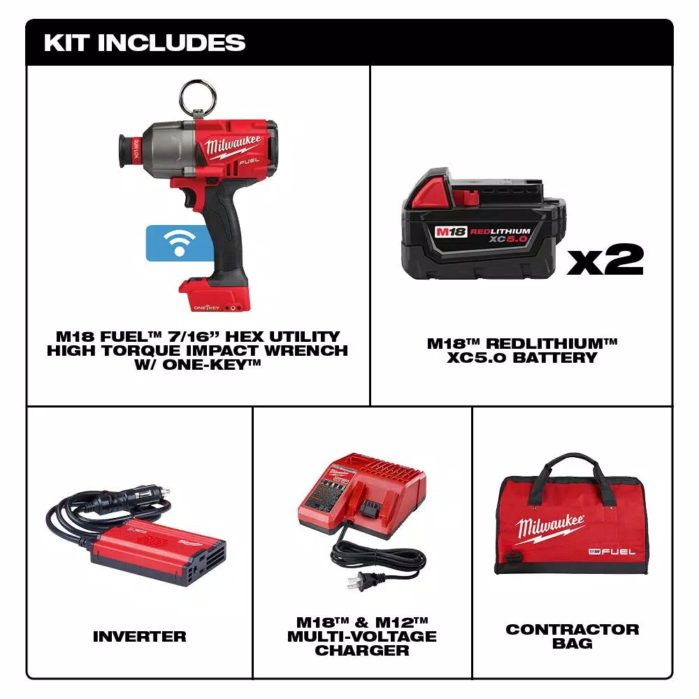 - Includes: 1 M18 FUEL 7/16 in. hex utility high torque impact wrench with ONE-KEY (2865-20), (2) M18 REDLITHIUM XC5.0 battery packs (48-11-1850), 1 AC charger (48-59-1812), one 12-Volt inverter (23-37-0010), 1 M18 FUEL contractor bag (50-55-3560)