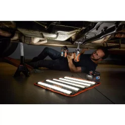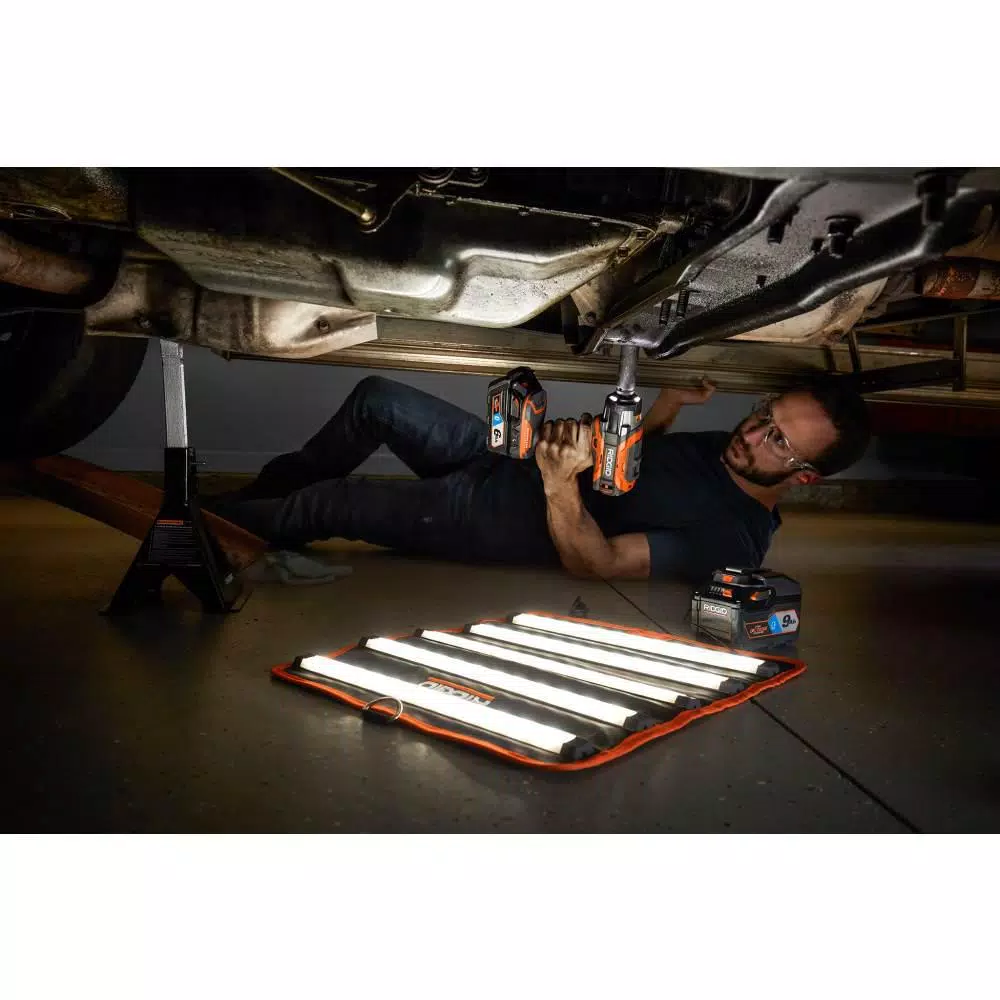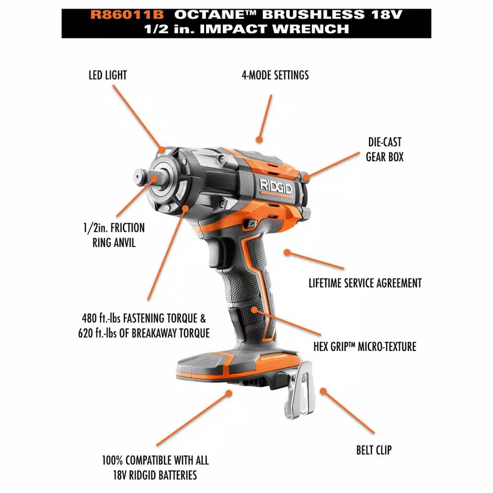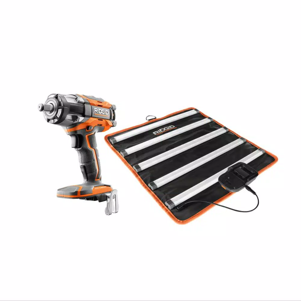 RIDGID introduces the 18-Volt Lithium-Ion Brushless Cordless OCTANE 1/2 in. Impact Wrench and LED Mat Light Kit (Tools Only). OCTANE Tools feature high performance brushless motors and advanced electronics, providing best-in-class power and intelligence. This impact wrench has 4-modes, including a unique auto mode, that help it to stand out from the competition and make it a must have in any shop. RIDGID OCTANE brushless motors offer up to 50% more runtime and longer motor life. The 18-Volt LED Mat Light can lay flat, roll, or hang for versatility on any jobsite. Wrap the light backwards with its high strength magnets to make it an area light, illuminating 360ยฐ. This mat is the most versatile light on the market, made to assist in brightening any jobsite no matter what the application. With registration, this kit is backed by the Industryโs Only Lifetime Service Agreement. The 18-Volt Lithium-Ion Brushless Cordless OCTANE 1/2 in. Impact Wrench and LED Mat Light Kit includes an 18-Volt Brushless 1/2 in. Impact Wrench with a belt clip and screws, an 18-Volt LED Mat Light with portable power source, and operatorโs manuals. Battery and charger are sold separately.
