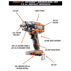 - Includes: (1) R86011 18-Volt OCTANE Brushless 1/2 in. Impact Wrench, (1) belt hook with screw, (1) Mat Light with hanging ring with (1) R86073 Portable Power Source, and operatorโs manuals