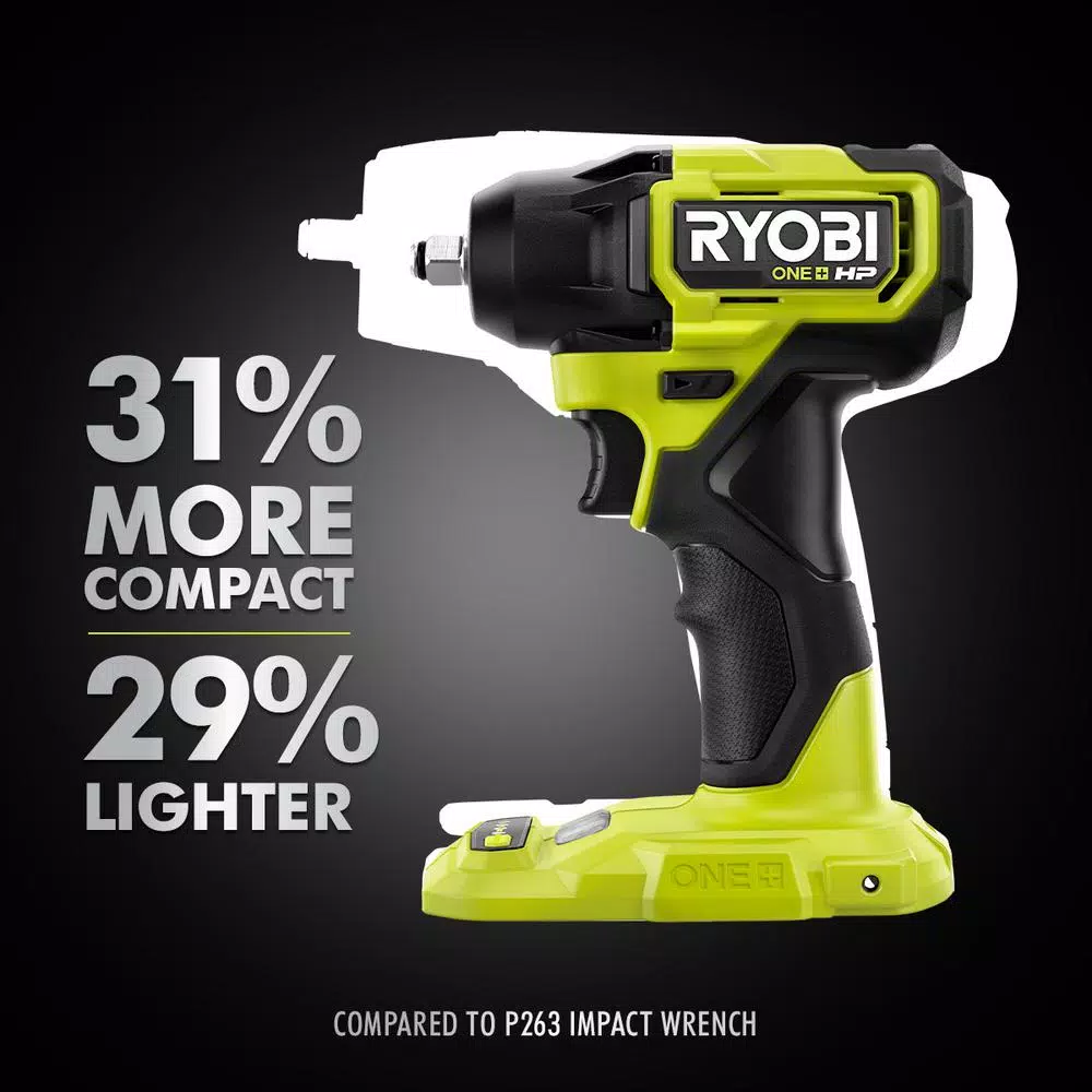 RYOBI introduces the ONE+ HP 18V Compact Brushless 4-Mode 3/8 in. Impact Wrench (Tool Only). This Compact Brushless 3/8 in. Impact Wrench is designed to live up to professional expectations, delivering a powerful solution in the most compact and lightweight design. Measuring at only 5.4 in. in length, this tool is 31% more compact and 29% lighter in weight than our brushed 3/8 in. Impact Wrench making it ideal for working in tight spots and completing overhead applications. Plus, itβs powered by a brushless motor, outputting up to 160 ft./lbs. of torque. It makes removing stubborn bolts a breeze. And to keep up with the demands of the jobsite, the optimized impacting mechanism delivers up to 3,900 IPM (Impacts Per Minute) to drive a variety of fasteners quickly and easily. So, what about speed control? This impact wrench has 4-modes β high, medium, low and a unique Auto Mode to prevent overtightening and uncontrolled removal in delicate or compact spaces like an engine bay. Best of all, it is part of the RYOBI ONE+ System of over 175 cordless tools that all work on the same battery platform. Backed by the RYOBI 3-Year Manufacturerβs Warranty, this ONE+ HP 18V Compact Brushless 4-Mode 3/8 in. Impact Wrench includes an operatorβs manual. Batteries and chargers are sold separately.