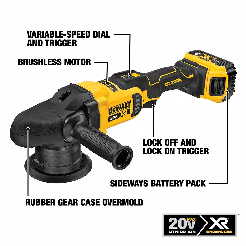 This 20-Volt MAX cordless kit includes a 5 in. Random Orbit Polisher, two 20-Volt MAX 5.0 Ah batteries, charger, and kit bag. The high-efficiency brushless motor delivers up to 75% more runtime over brushed. The variable-speed trigger and dial allow for better control during car, headlight, windshield, and glass polishing applications. The 2.1 in. orbit diameter combined with the included 5 in. backing plate is recommended for most applications.