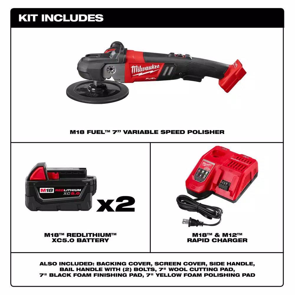 - Includes: (1)Β M18 FUEL 7 in. Variable Speed Polisher (Tool Only)Β (2738-20),(2)Β M18 REDLITHIUM XC5.0 Extended Capacity Battery PackΒ (48-11-1850), (1)Β M18 & M12 Rapid ChargerΒ (48-59-1808), (1)Β 7 in. Wool Cutting Pad, (1)Β 7 in. Yellow Foam Polishing Pad, (1)Β 7 in. Black Foam Finishing Pad, (1)Β Backing Pad, (1)Β Screen Cover, (1)Β Side Handle, (1)Β Bail Handle with 2 Bolt