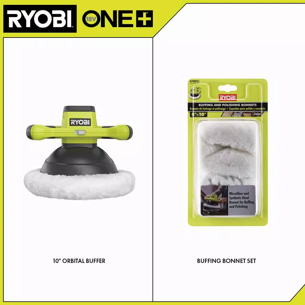RYOBI introduces the 18V ONE+ Cordless 10 in. Orbital Buffer with Extra 8-10 in. Microfiber and Synthetic Fleece Buffing Bonnet Set (2-Pack). This tool provides up to 2,500 RPMs for a swirl-free finish while offering the user cordless convenience. With a powerful motor, this buffer maintains optimum performance during extended use. The 18V ONE+ 10 in. Orbital Buffer runs up to 1.5 hours with the 18V ONE+ lithium-Ion 4.0 Ah LITHIUM+ High Capacity Battery (P108 Battery, sold separately). Best of all, it is part of the RYOBI ONE+ System of over 175 Cordless Tools that all work on the same battery platform. Backed by the RYOBI 3-Year Manufacturerโs Warranty, the 10 in. Orbital Buffer includes two elastic applicator bonnets, two elastic buffing bonnets, and an operatorโs manual. Battery and charger sold separately.