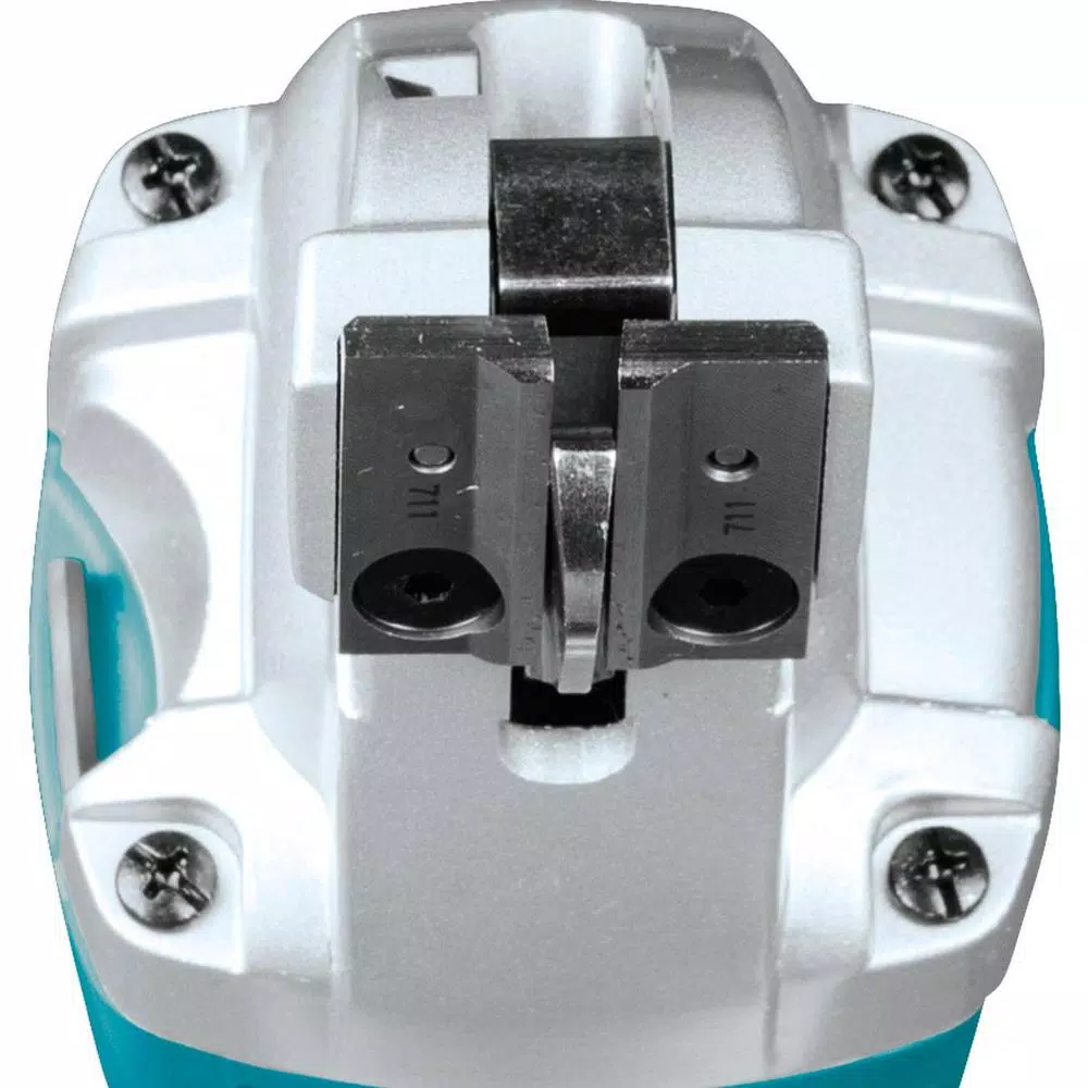 The Makita 18-Volt LXT Lithium-Ion Cordless 16-Gauge Straight Shear (model XSJ02Z, tool only) combines high speed and increased maneuverability in a compact size with less weight. The XSJ02Z has a Makita-built 4-pole motor with 4,300 strokes per minute for faster cutting, yet it weighs only 5.1 lbs. (with battery, sold separately) for better control in cutting steel and stainless steel sheet metal. The XSJ02Z features a high performance double blade design that minimizes material distortion and produces clean cuts with minimal burrs. It will cut up to 16-Gauge mild steel, 18-Gauge stainless steel and 12-Gauge aluminum. For increased application versatility it has a radius cutting capability of 9-7/8 in. Dia. Convenience features include a barrel grip design, rubberized soft grip handle and a slide switch with lock-on capability for continuous operation. Its part of Makitaโs expanding 18-Volt Lithium-Ion system, the worlds largest cordless tool system powered by 18-Volt Lithium-Ion slide-style batteries. Makita 18-Volt Lithium-Ion batteries have the fastest charge times in their categories, so they spend more time working and less time sitting on the charger. For improved tool performance and extended battery life, Makita created Star Protection Computer Controls.
