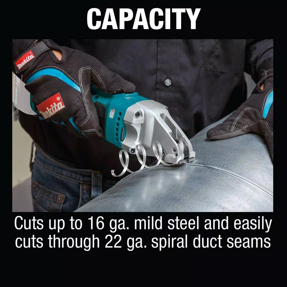 - Cuts up to 16-Gauge mild steel, 18-Gauge stainless steel and easily cuts through 22-Gauge spiral duct seams