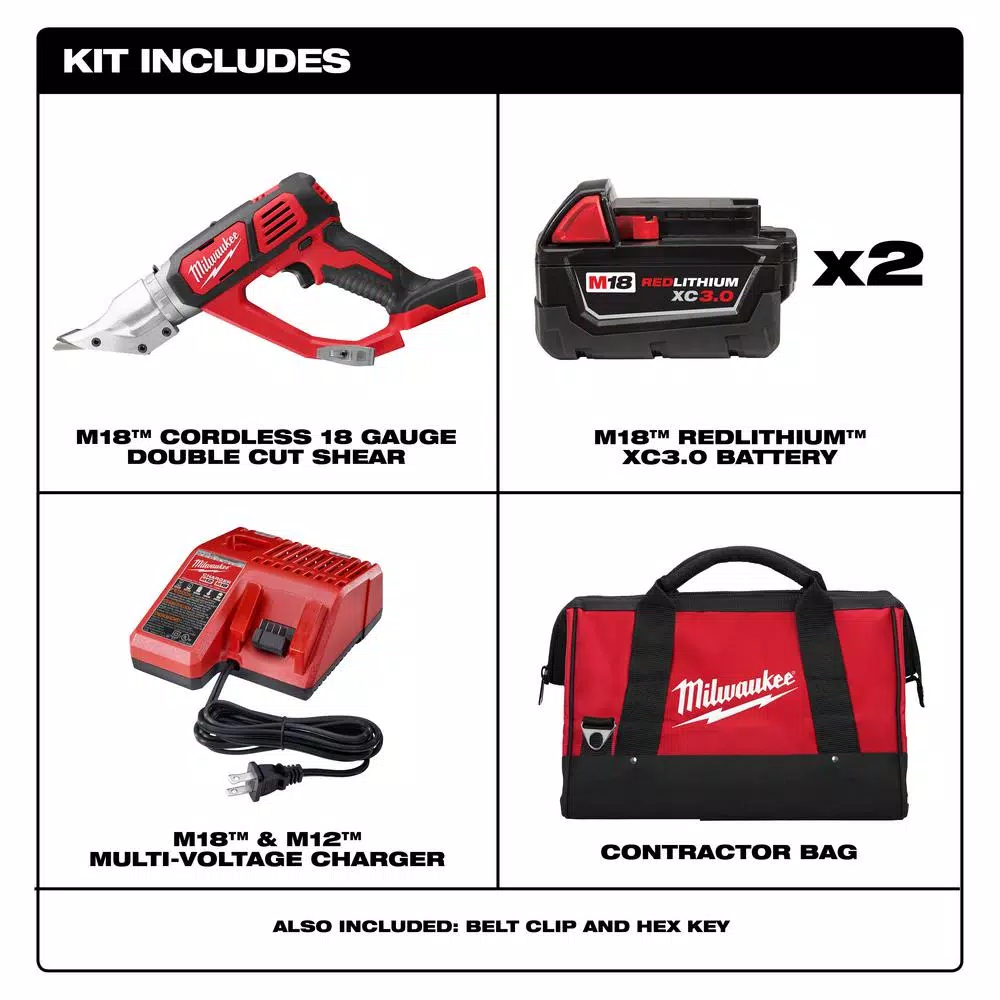 - Includes: (1) M18 18 Gauge Double Cut Shear 2635-20, (1) M18 & M12 Multi-Voltage Charger 48-59-1812, (2) M18 REDLITHIUM XC3.0 Battery 48-11-1828, (1) Contractor Bag, (1) Belt Clip